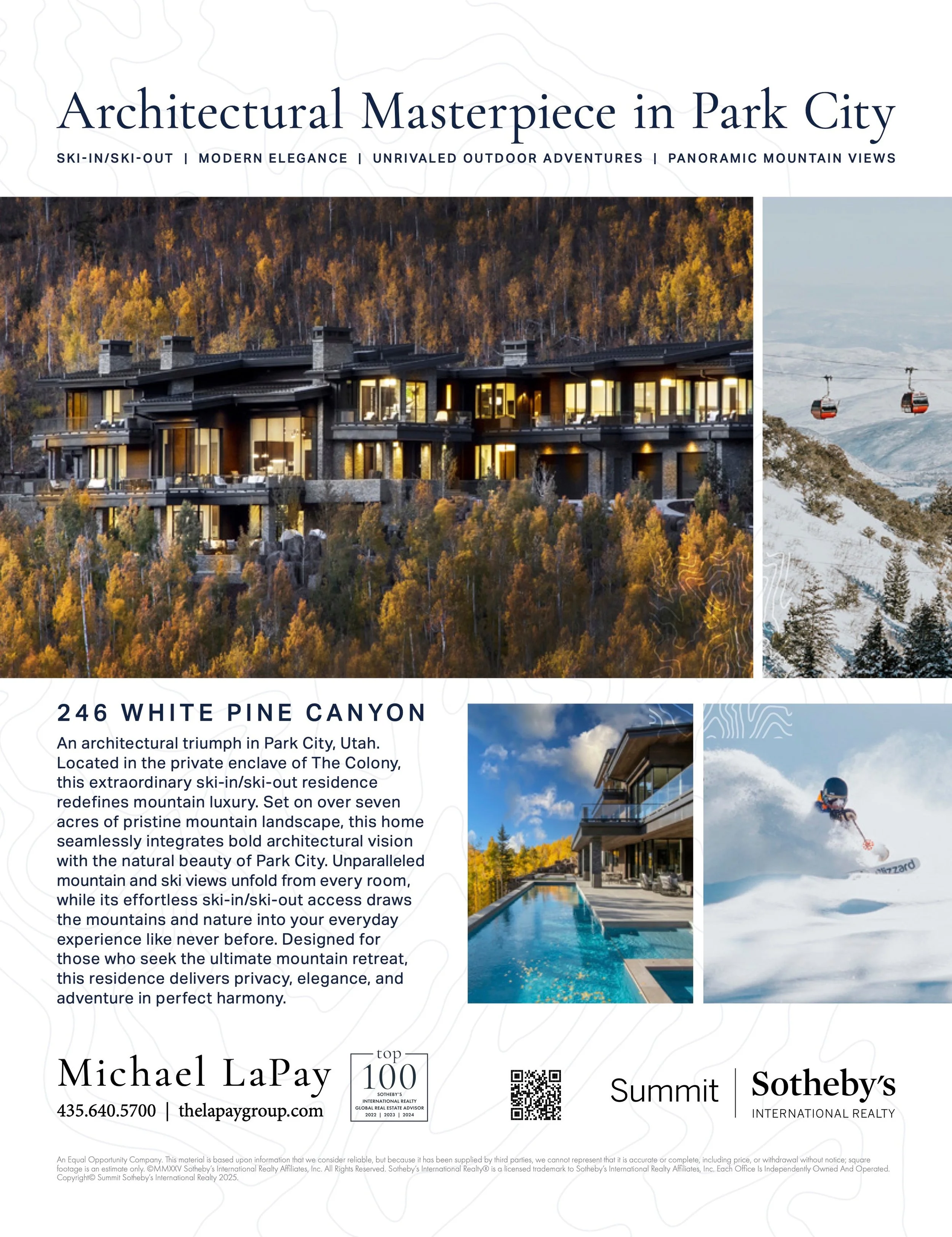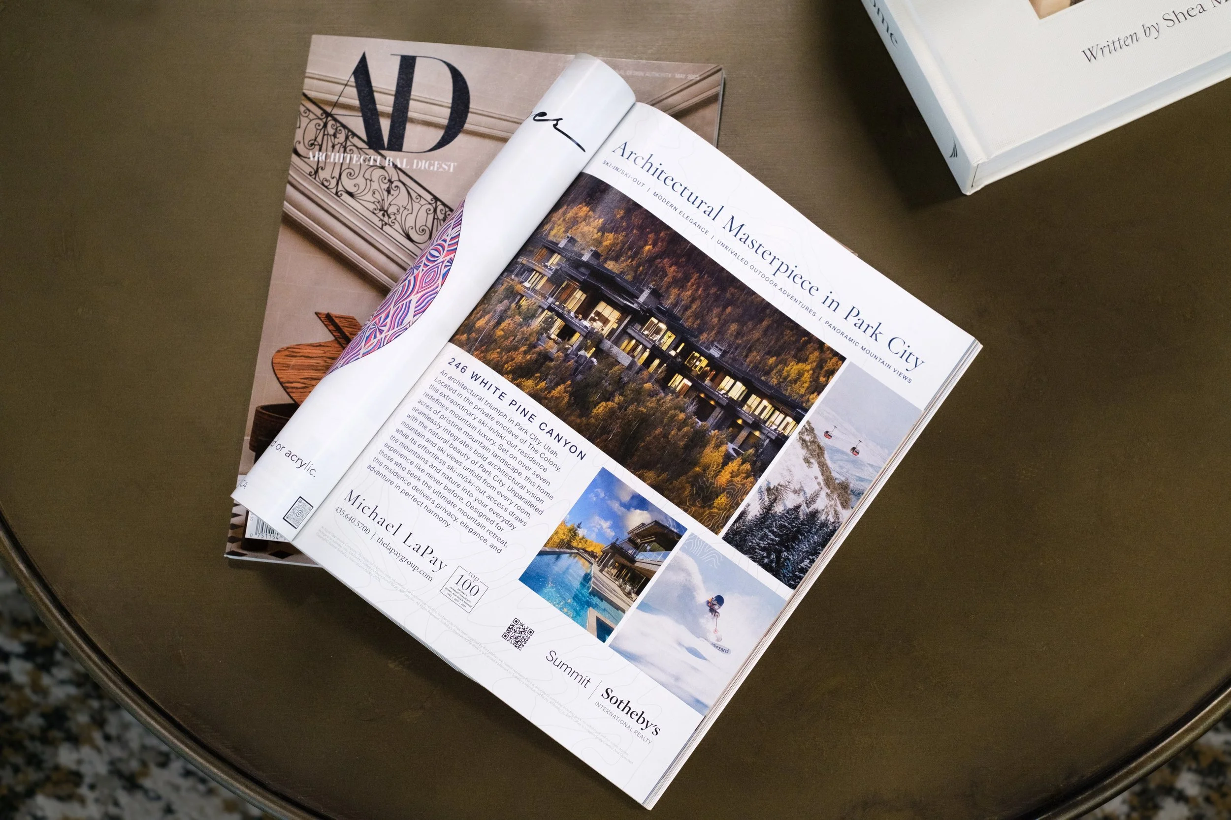 Positioned at nearly $30M, this ski-in/ski-out residence required balancing input from both the listing agents and the sellers while meeting Architectural Digest’s early publication deadlines. I collaborated with the lead designer mid-property branding to select typography, layout, and visual interest that complemented the home’s story. Subtle topography contour lines highlight the mountain setting, while photography showcases multiple seasons of lifestyle—reflecting the property’s year-round appeal. The final design delivers a refined, luxury-focused narrative, positioning the home as both aspirational and uniquely connected to Canyons Mountain.